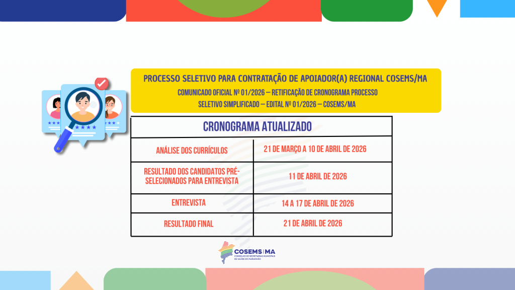 📢 PROCESSO SELETIVO PARA CONTRATAÇÃO DE APOIADOR(A) REGIONAL – COSEMS/MA O Conselho de Secretarias Municipais de Saúde do Maranhão (COSEMS/MA) torna público o Processo Seletivo para Contratação de Apoiador(a) Regional. […]